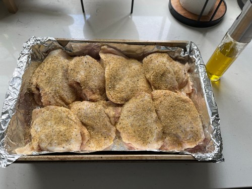 - Arrange chicken thighs on prepared baking sheet and coat with olive oil.
