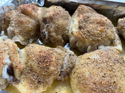 - Combine garlic salt, onion salt, oregano, thyme, paprika, and pepper together in a small container with a lid. Close the lid and shake container until spices are thoroughly mixed. Sprinkle spice mixture liberally over chicken thighs.