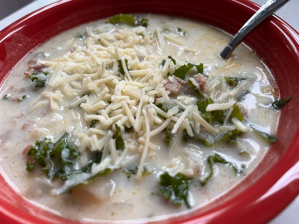 Serve zuppa toscana immediately with shredded parmesan cheese as garnish.