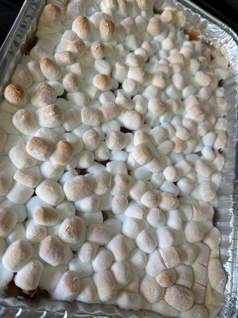 - Place potatoes in a large bowl. Add sugar and next 3 ingredients (through vanilla). Mash sweet potato mixture with a potato masher. Fold in 1/4 cup pecans. Scrape potato mixture into an even layer in an 11 x 7-inch baking dish coated with cooking spray. Sprinkle with remaining 1/4 cup pecans; top with marshmallows. Bake at 375° F for 25 minutes or until golden.
