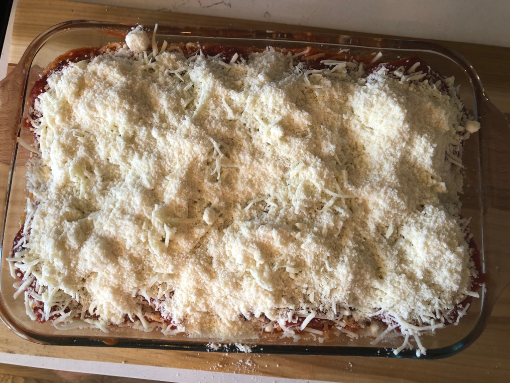 - Top the chicken with the remaining sauce and spread it evenly to cover all of the contents of the casserole dish. Evenly sprinkle the top with 1 cup (or more) of shredded mozzarella and 1/2 cup of grated parmesan cheese.