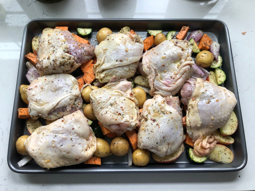 5. Place marinated chicken thighs on top of the vegetables and fruit and pour any extra marinade over the chicken.