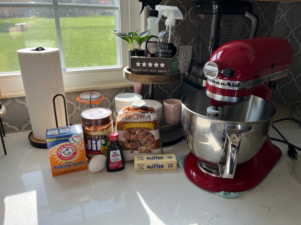 - In a large bowl, or bowl of a stand mixer, beat together the butter, granulated sugar, brown sugar and peanut butter until light in color and fluffy looking. About 1-2 minutes.