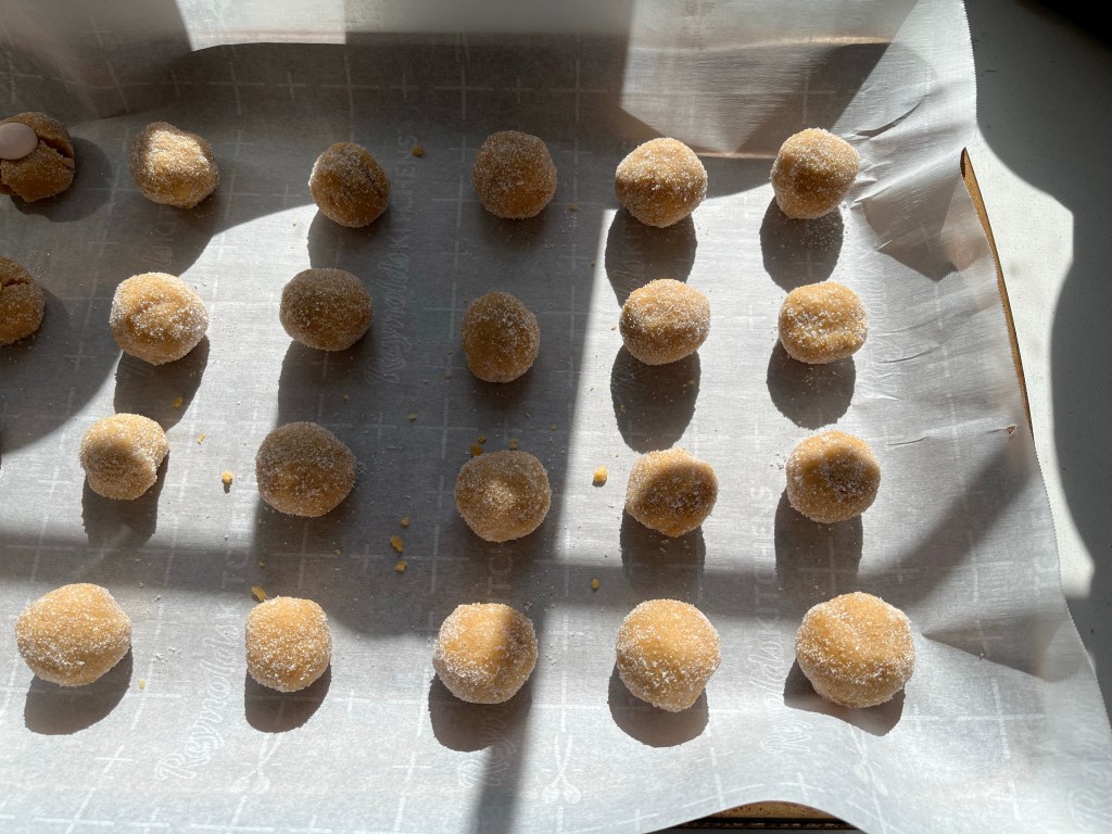 - Measure the ¼ cup granulated sugar and place it in a bowl. Take a pinch of dough (about a tablespoon) and roll into a ball. Roll the cookie dough ball into the sugar and place on prepared cookie sheet.