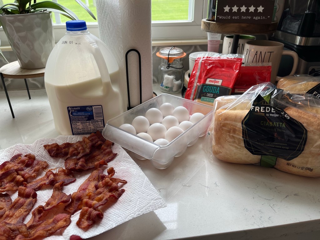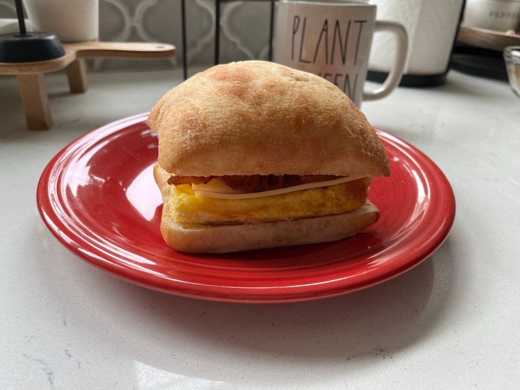 - Lay the bottom part of ciabatta rolls on a large sheet pan and assemble sandwiches with egg, gouda, and bacon and replace the top half of the ciabatta rolls.
