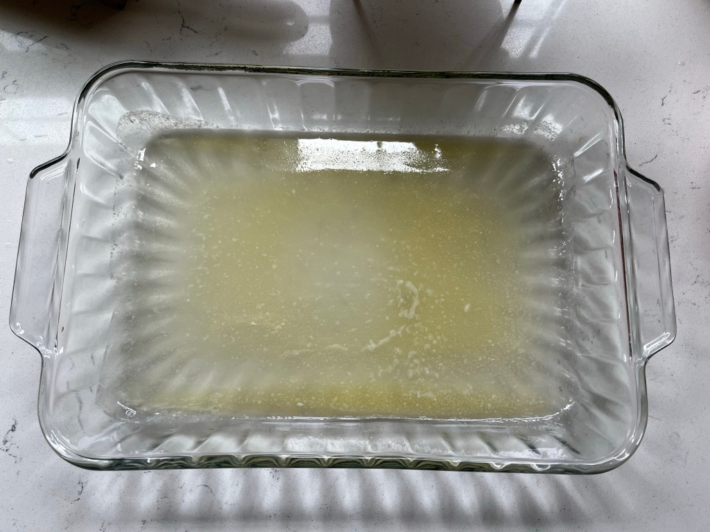- Add melted butter to the bottom of a 9″ x 13″ glass baking dish and coat evenly.