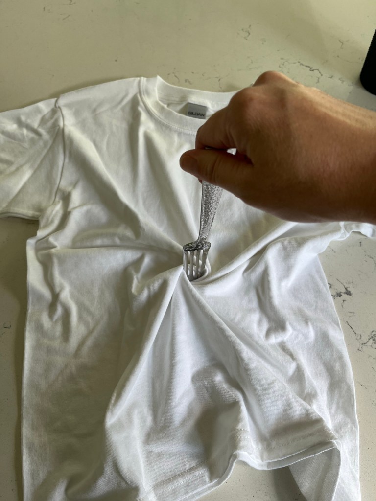 Begin by sticking a fork in the middle of the shirt or item you are dying and twisting until the entire piece is twisted around in a type of cinnamon bun shape. **Note: If you want a very solidly colored tie dye, soak the shirt in water prior to twisting the shirt into a bun shape. If you’d like a shirt that has some white left in the pattern like ours is shown above, do not soak the shirt yet.**