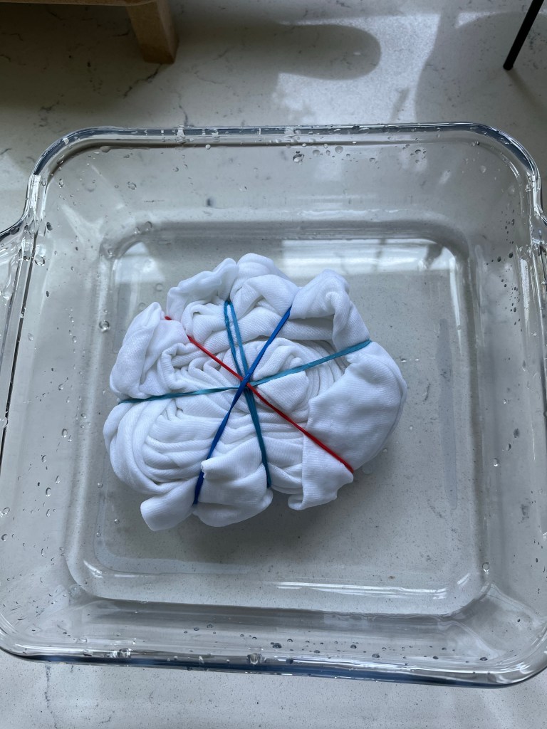 Soak the bun shaped fabric in water. The more saturated the piece, the more solid the dye will be. The less saturated, the more white there will be. If you want solid color tie dye, soak the shirt prior to twisting and placing rubber bands around it.