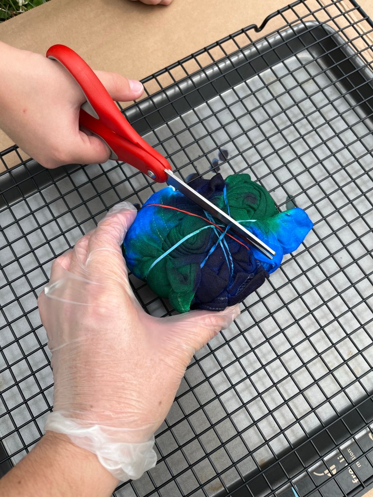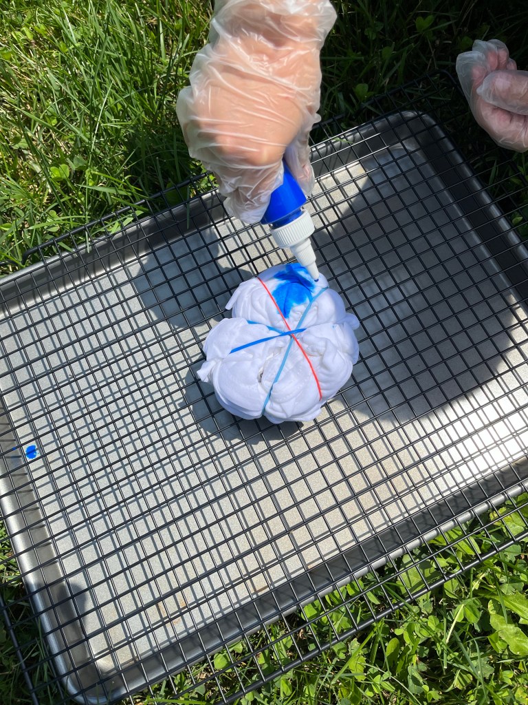 Sit the soaked shirt on a wire cooling rack over a large baking sheet. Apply the dye one section at a time saturating the shirt as much or as little as you’d like. The more saturated, the darker and more solid colored the shirt will be.