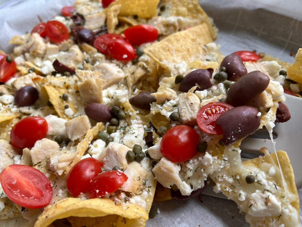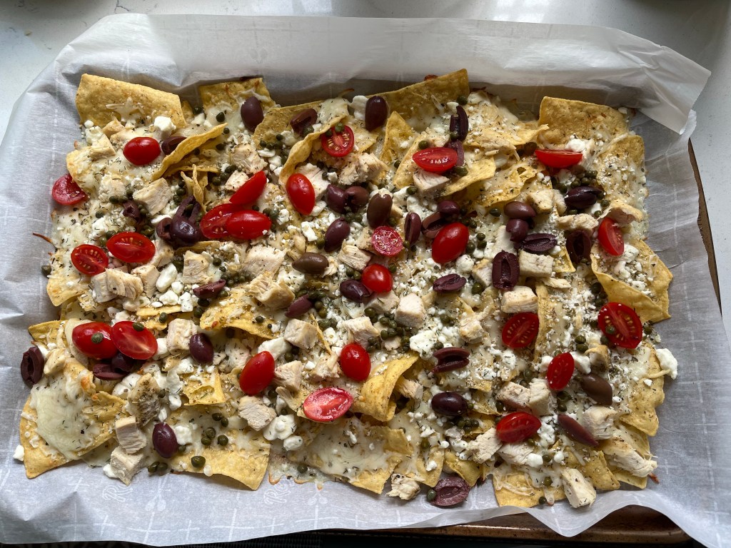 I’m always a huge fan of any Greek or Mediterranean recipes, so why not nachos? I made Greek pasta last night and had all of the ingredients opened in the fridge and couldn’t figure out what to do with them. So, nachos for a crowd! These are great because you can customize them any way you’d like. Don’t like capers? Don’t include them! Have some banana peppers? They’re a great addition! Don’t have fresh tomatoes? Used canned! This a great throw in everything you have recipe when you want to use ingredients that wouldn’t normally be used. Enjoy!