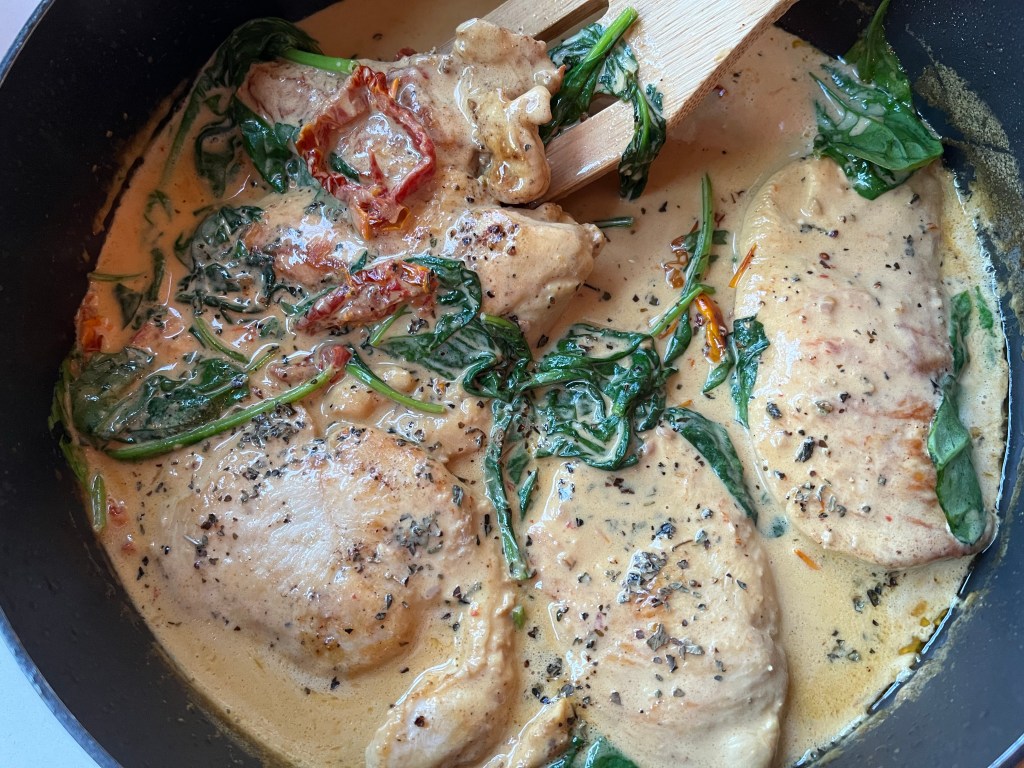 - Add cooked rice and chicken to the simmering pot until everything is well combined.