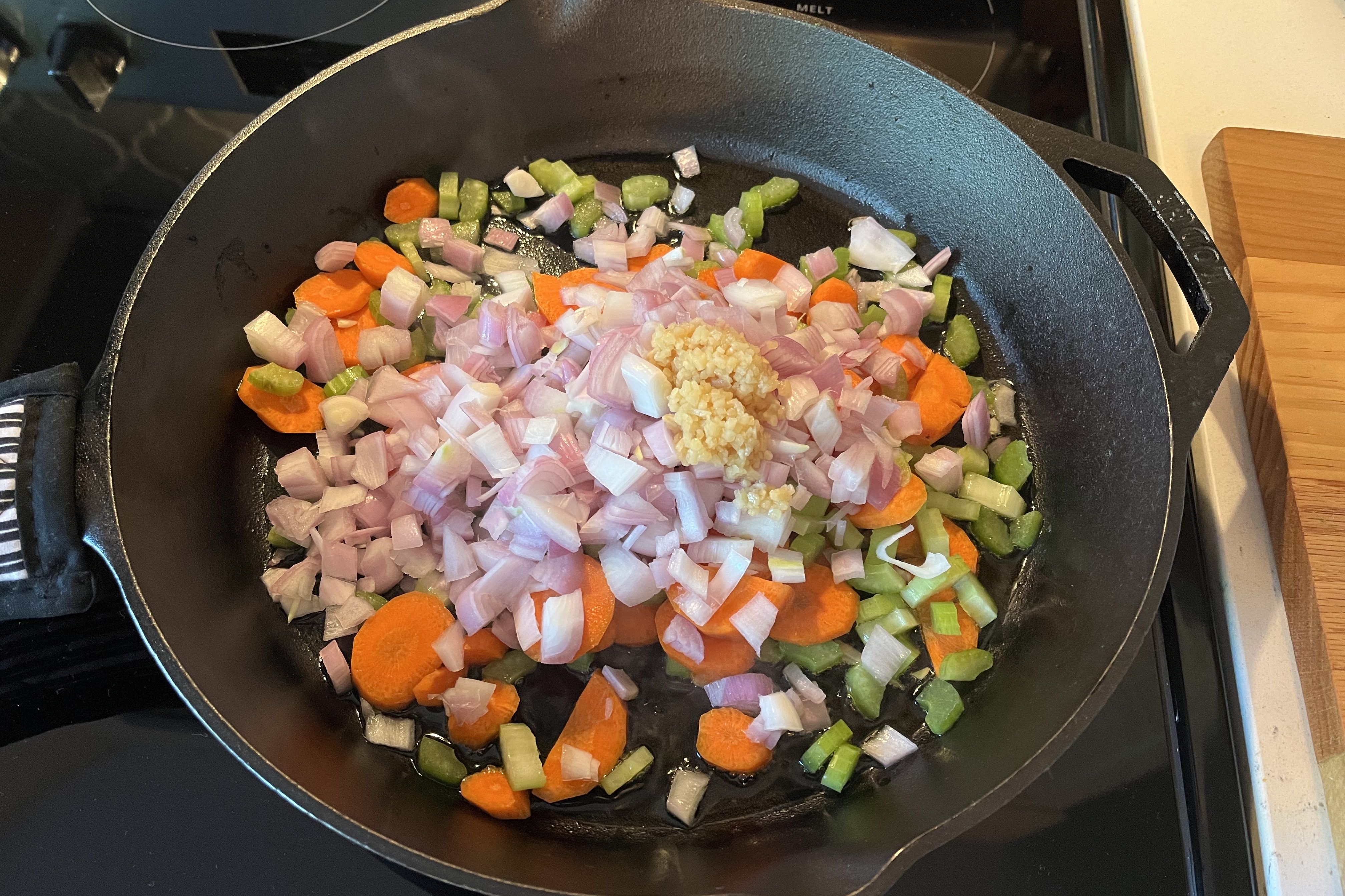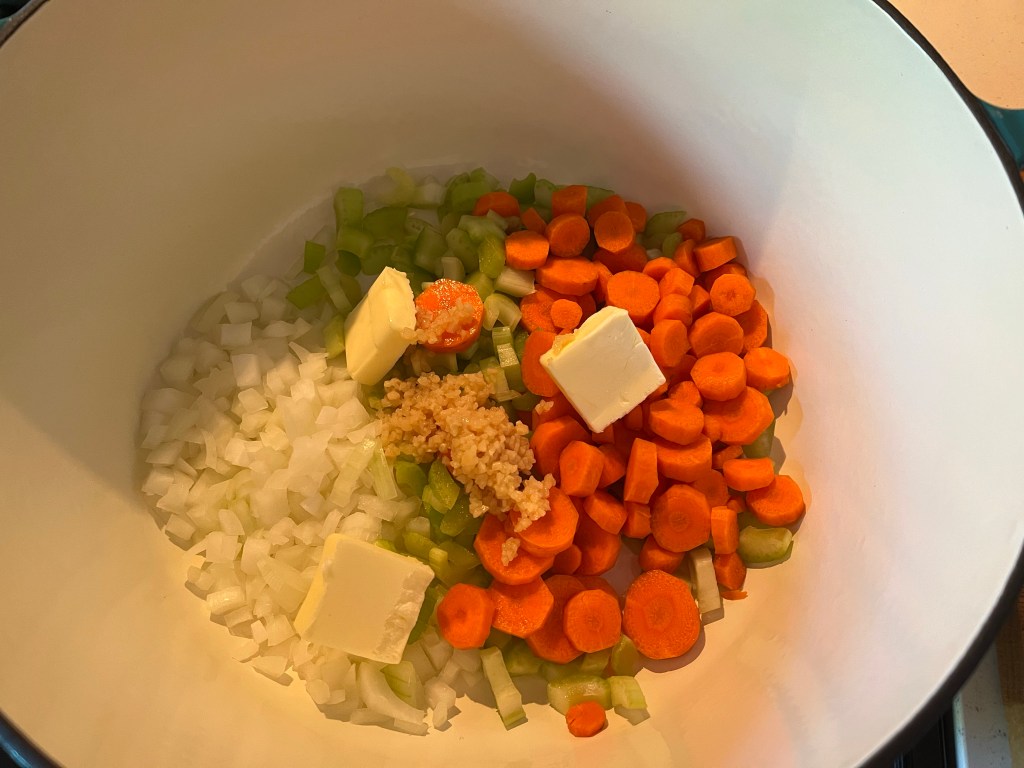 - Saute onion, carrots, celery, and garlic in 2-3 Tbsp of butter in large pot or dutch oven on medium-high until soft and fragrant.