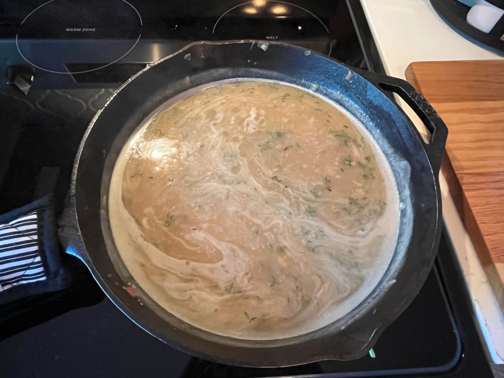 - Add chicken stock and 2 cups of water to skillet. Add seasonings and bay leaves and bring to a low boil. Reduce heat to medium or medium low to simmer.