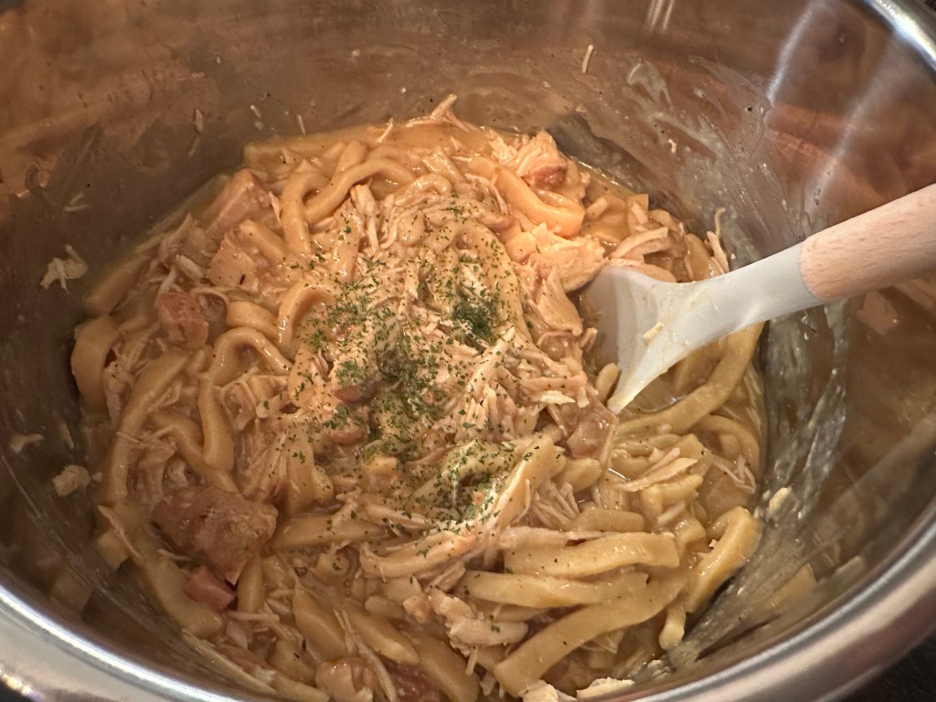 - Do a quick steam release. Remove the turkey cutlets and shred or if using fully cooked turkey, stir the shredded turkey into the noodles until well incorporated and heated through and serve.