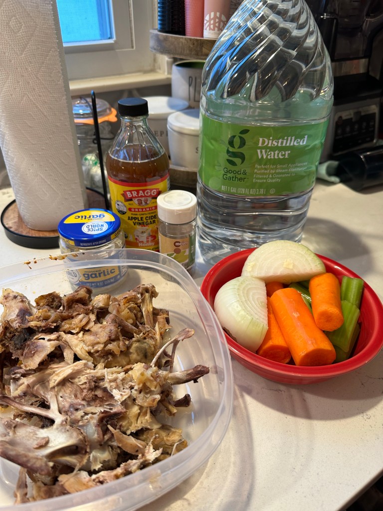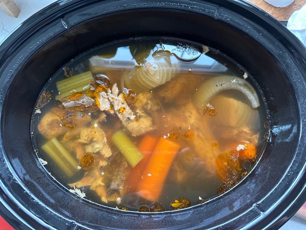 1. Add carcass and any pan juices to the slow cooker. Add all other ingredients and cover with 12 cups of filtered water.