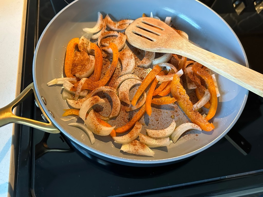 Add sliced onion and bell pepper; sprinkle with a coating of taco or Mexican seasoning and cook, stirring frequently, until soft.