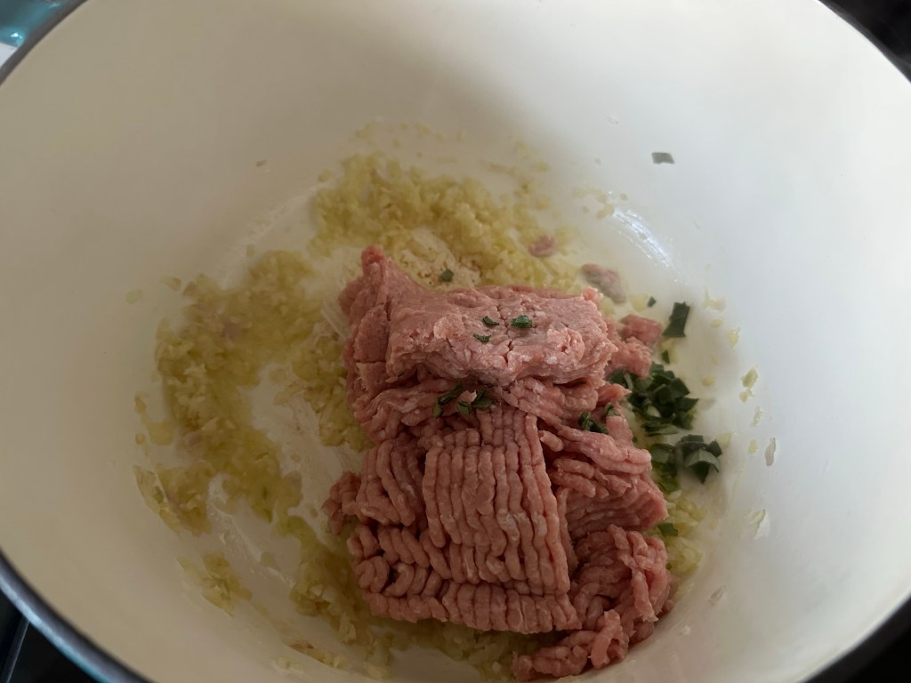 Put a large pot of water on a burner on high heat to prepare to boil the pasta. While pasta water is heating, add chopped sage leaves and ground turkey to the pot and cook 3-4 more minutes until turkey is lightly browned.
