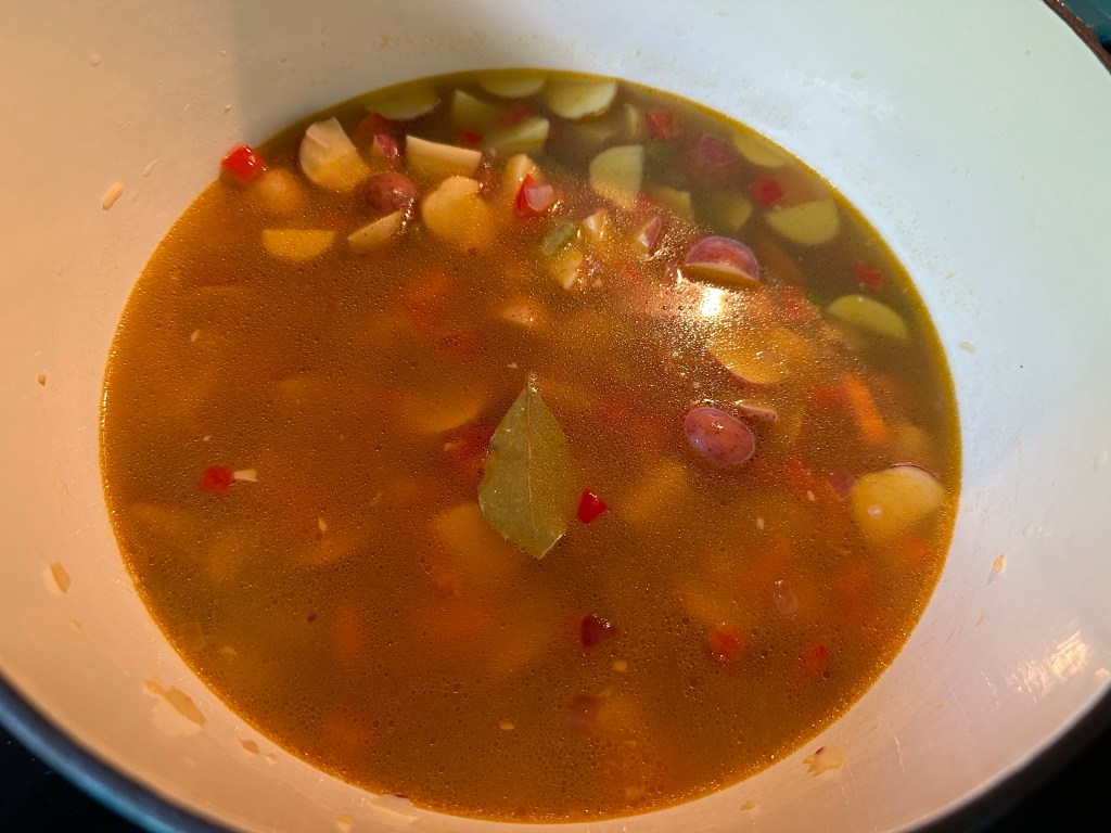 - Add potatoes, vegetable broth, and bay leaf. Bring to a boil, reduce heat, and simmer covered for 20 minutes.