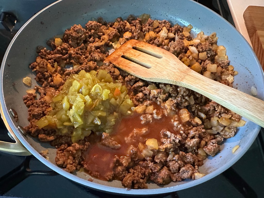 - When beef is almost cooked through and onions begin to become transluescent, stir in the green chiles and enchilada sauce. Turn off heat. Set aside.