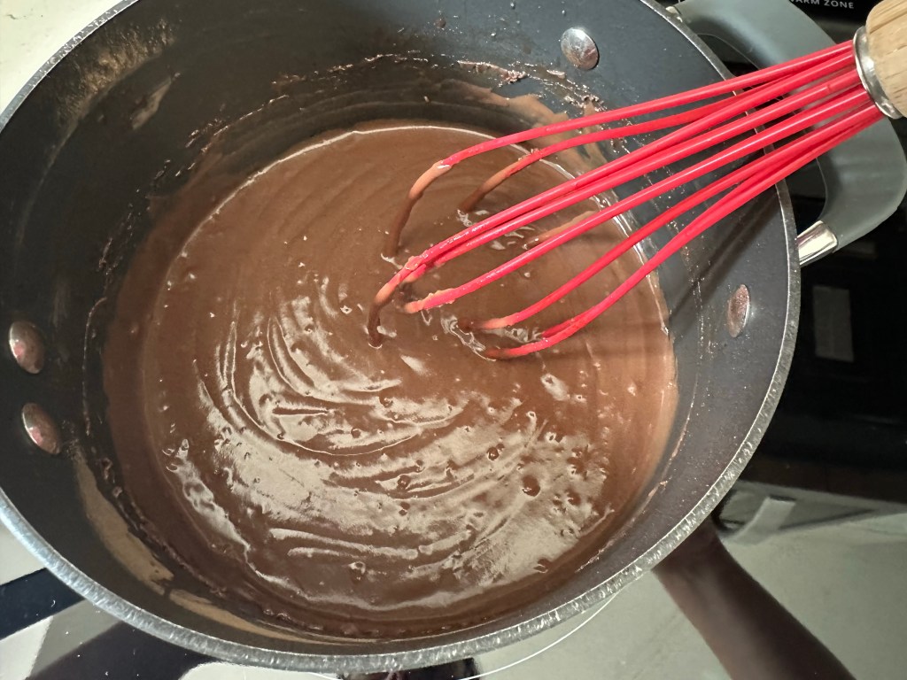 - Mix 1 cup sugar, 6 Tbsp flour, 1/8 tsp salt, 1/4 cup unsweetened cocoa powder well in a sauce pan and set aside.