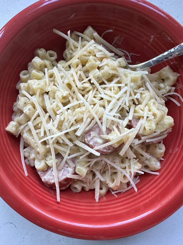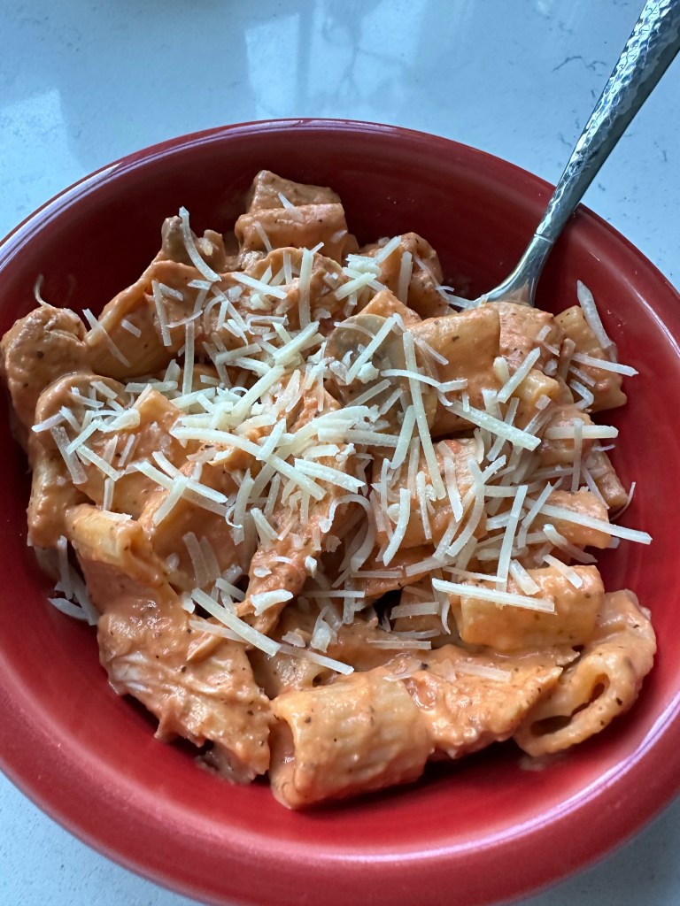 - Reduce heat to medium-low. Stir in broccoli; cover, and cook until tender and bright green, 3 to 5 minutes. Stir in chicken, the softened cubed cream cheese, cream and salt and pepper. Cook, stirring, until the cream cheese is melted and the chicken is heated through, about 4 minutes.