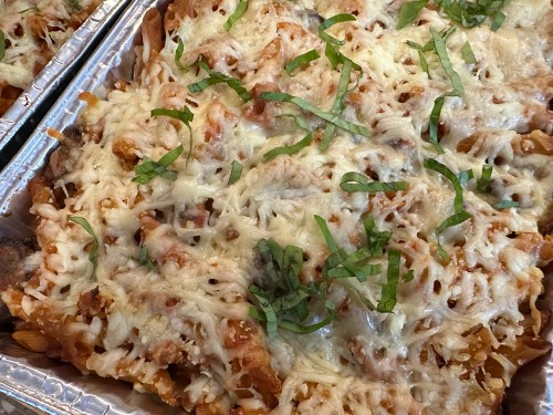 - Add remaining Parmesan cheese and fresh basil to baked pasta and serve immediately.